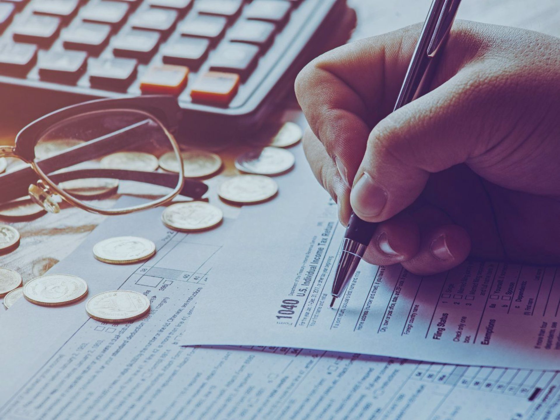 PESSOA ESCREVENDO EM PAPEL SOBRE A MESA COM UM ÓCULOS E ALGUMAS MOEADAS APOIADO